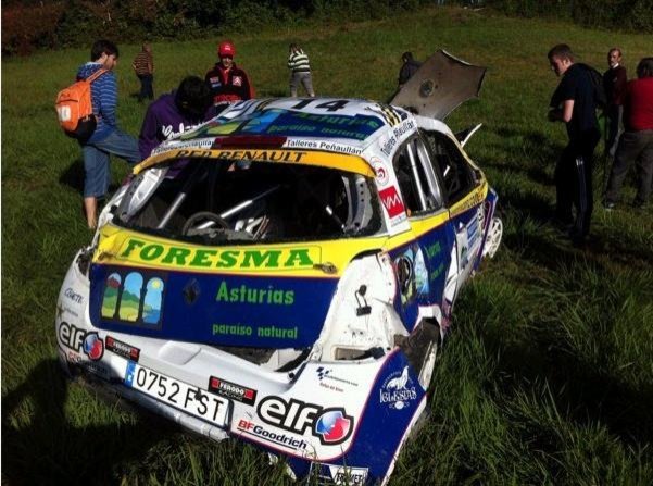Tras quedarse sin frenos, José y Cándido han dejado de esta forma el Renault Clio R3.Parece ser que a los pilotos no les ha pasado nada grave, aunque en un principio han quedado un poco aturdidos por el fuerte impacto.Ánimo chicos!!!!!.
