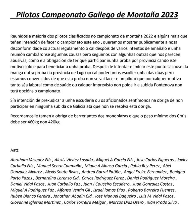 Paralizada, así se encuentra ahora mismo la actividad en el Campeonato Gallego de Montaña. La mayoría de los pilotos protagonístas del campeonato en 2022 han emitido un comunicado en redes sociales en el que hacen publico su mal estar con el reglamento actual. El principal punto de discordancia es la obligación que se ha impuesto de disputar una prueba en cada provincia, para así poder optar al Campeonato. Con esta norma, se busca obligar a todos los pilotos interesados a disputar una subida en concreto, que sería la única beneficiada. En dicho comunicado también se hace referencia al peso mínimo estipulado para los Cm´s, que también se modificó en contra de lo opinión de estos pilotos.
