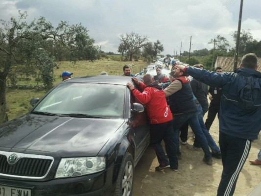 Pasa Ogier y nos vamos rápido para salir del presumible atasco, pero una furgoneta de la organización impide nuestra salida. Tras una serenata de pitidos de varios coches que querían salir, nuestro jefe de mantenimiento descubre que la puerta trasera está abierta, entra y abre la puerta delantera. Saca el freno de mano y empujando el coche entre varios "indignados" logramos salir. Nos vamos para casa!!!! Pero aun nos quedaba un trabajillo por hacer. A veces la gente aparca francamente mal y seis coches, tres a cada lado, no perimitían el paso de nuestra furgoneta ni el de una ranchera portuguesa, por lo que con un poco de ayuda y todos a la de tres, los coches fueron desapareciendo poco a poco de en medio. Lo sentimos si algún coche quedó rayado, pero si estuvieran bien aparcados no les hubiera pasado nada. Y es que nuestros amigos portugueses para estas cosas a veces se vuelven " maloucos" y alguno, si sus amigos le dejasen, hasta mandaba a uno de estos coches balado abajo!!!!!.